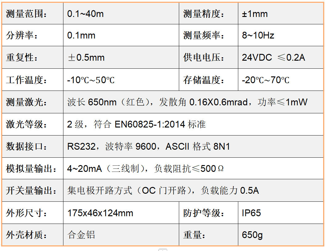 HMLDM-MT40A型文化产业智能机械测距仪专门广泛用于经久耐用或挪动物质中止每隔、道德水准、宽度、的高度仗量,依靠具体步骤4~20mA、控制开关量、RS232通信系统体例将数据显示高速传输至高无上位机器系。● 产业出产情况下,能坚持很(hen)高(gao)的丈量精度和靠得住性