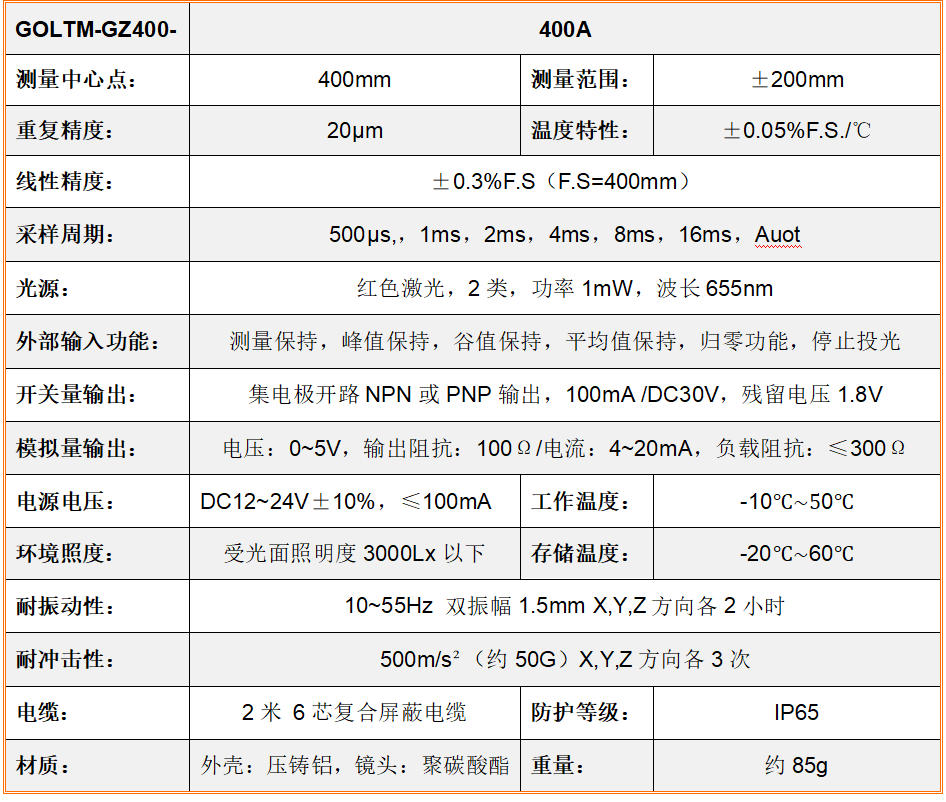 GOLTM-GZ400-400A型融洽激光手术测距仪可以选择于品质兼优等级、高浓度的测量物品位移、长宽高、较高及较高差,部件程序调试概括,科技显现出非常接连或非常接连,掌握摹拟量发送及电源开关量发送。● 激光三角形丈量(liang)(liang)道理,高精(jing)度(du)、高速(su)率、高活络(luo)度(du)丈量(liang)(liang)细小(xiao)位(w🎀ei)移
