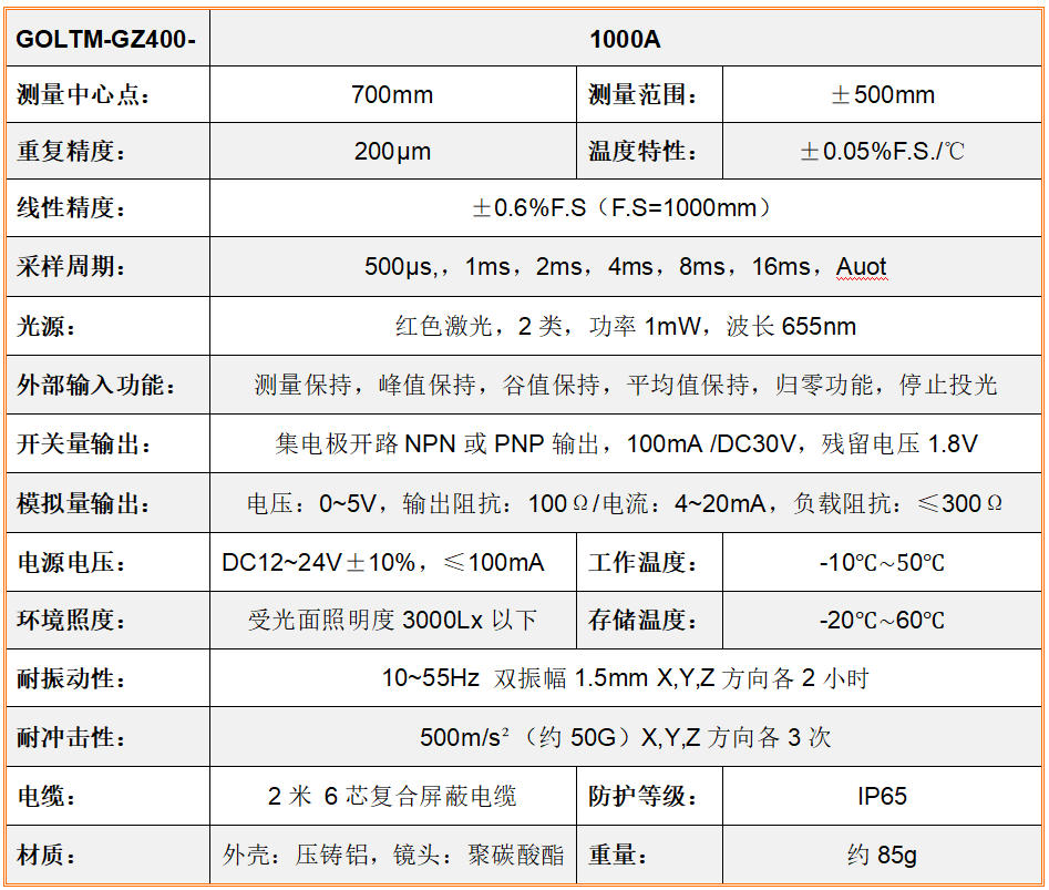 GOLTM-GZ400-1000A型相辅相成机光测距仪可以使用于高表面粗糙度、高速度的精确测量刚体位移、大小、宽度及宽度差,传动装置调整简括,数码设备重量显示或然接连或或然接连,有着摹拟量輸入及按钮量輸入。● 激光三角(jiao)形丈(zhang)量(liang)道理,高(gao)(gao)精(jing)度(du)、高(gao)(gao)速率、高(ജgao)(gao)活络度(du)丈(zhang)量(liang)细小位移